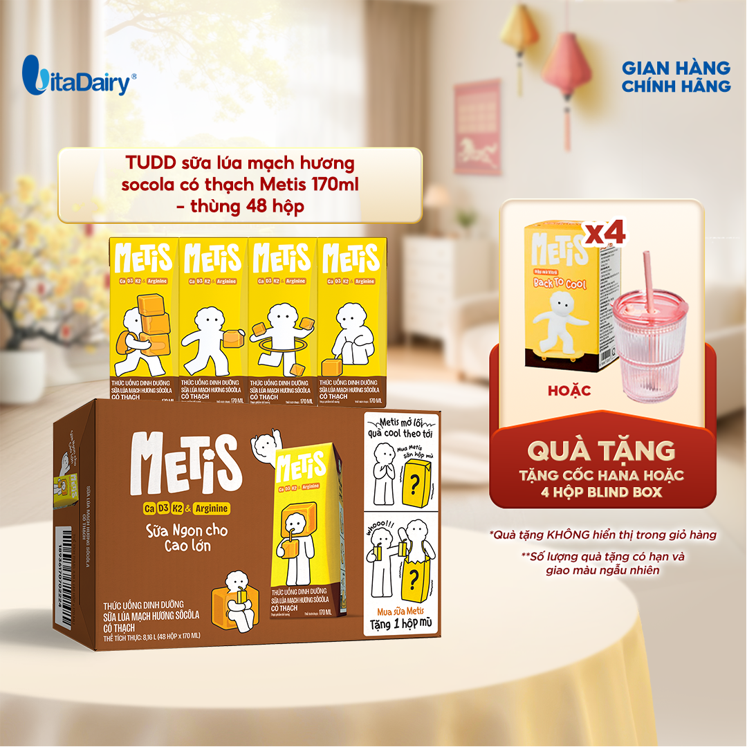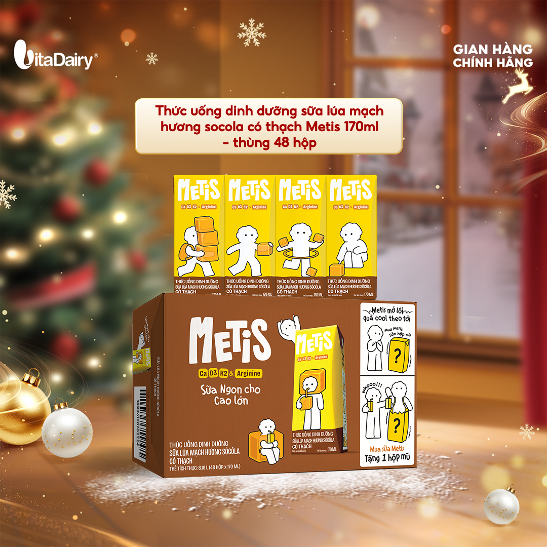 Thức uống dinh dưỡng sữa lúa mạch hương socola có thạch Metis 170ml - thùng 48 hộp
